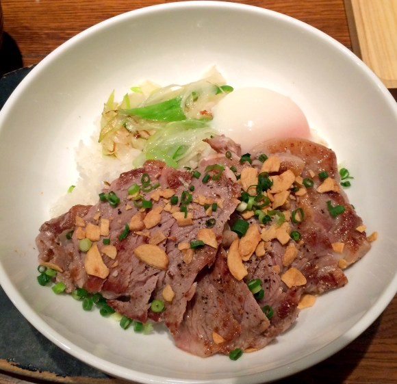 しばらく待つと、ステーキ丼来たよ! ソースはにんにくしょう油でお願いしておいた。肉の上にはフライドガーリック、その上からしょう油をかけると……。美しい肉色にしょう油の照りが加わってさらにウマそうに見える!