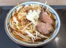 麺はコシのある極太麺。ラーメンというか、もはや極細のうどんと言えるかもしれない。太麺が苦手な私だが、濃いつゆの味が麺をガシガシ食べさせてくれる。このジャンクな味はイメージ通りの「ラーメン二郎」だが、確かにウマイ。