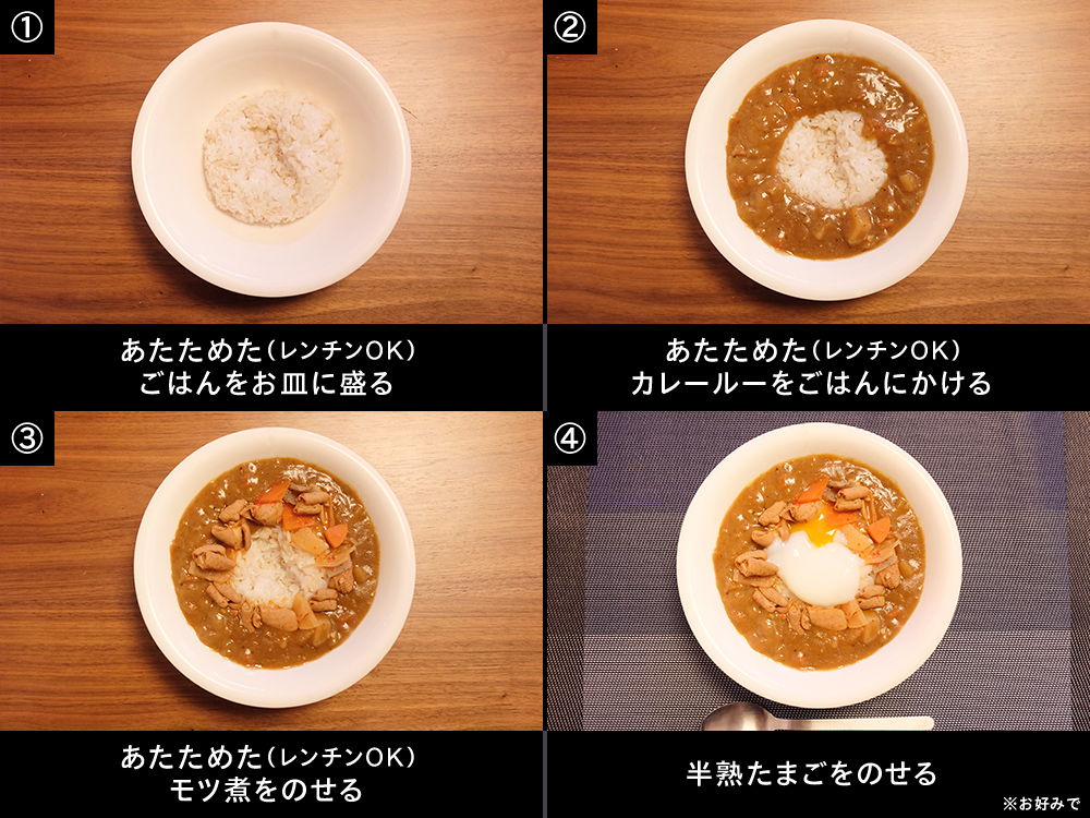 温めたごはんにカレーをかける → モツ煮をのせる → 半熟たまごをトッピング(お好みで)