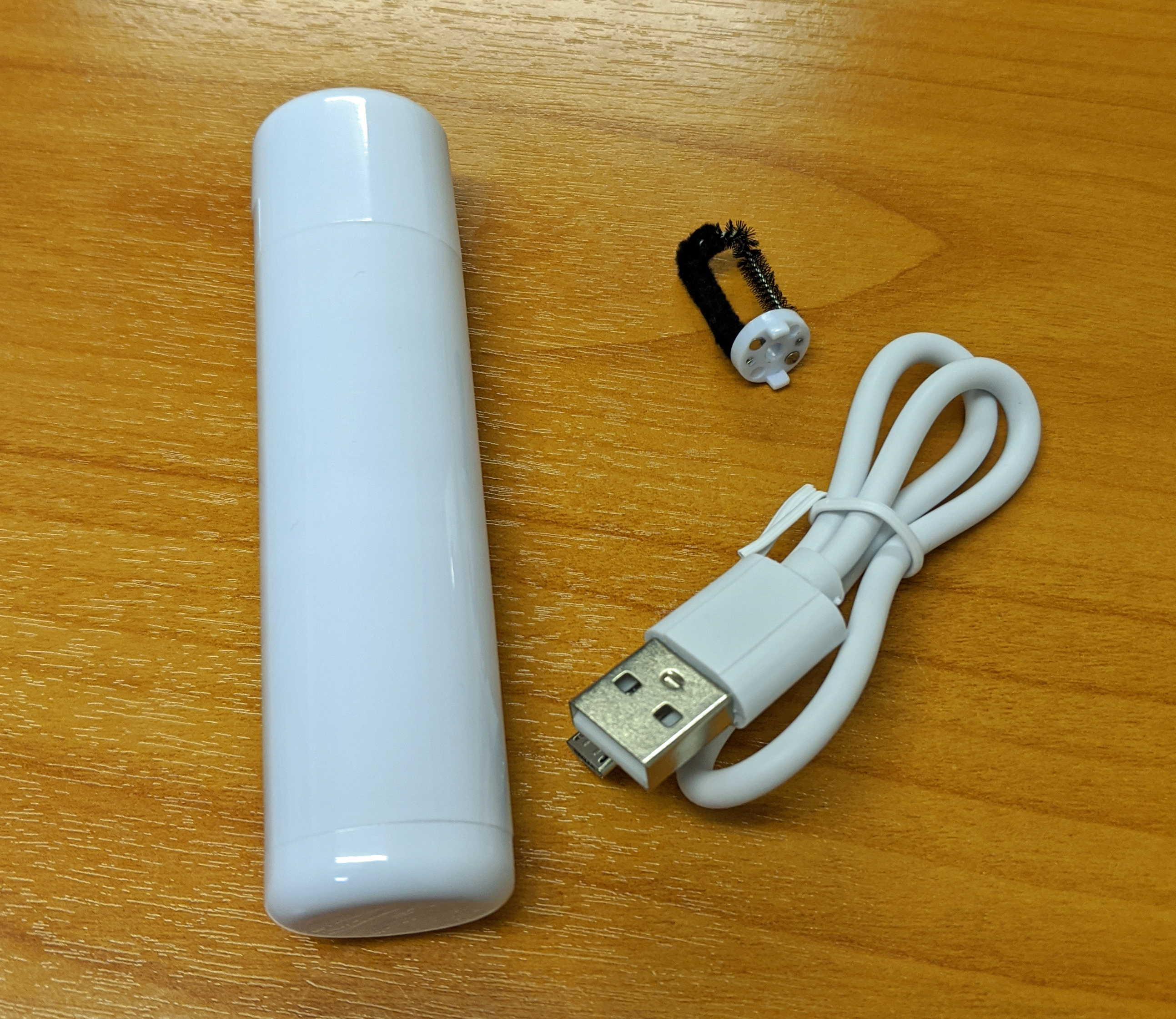 正規品ではないので安全に使用できるか不明だが、1秒でも早く綿棒掃除から解放されたい思いで購入してみた。中身は電動クリーナー本体と替えのブラシ。それに充電用のケーブルである。