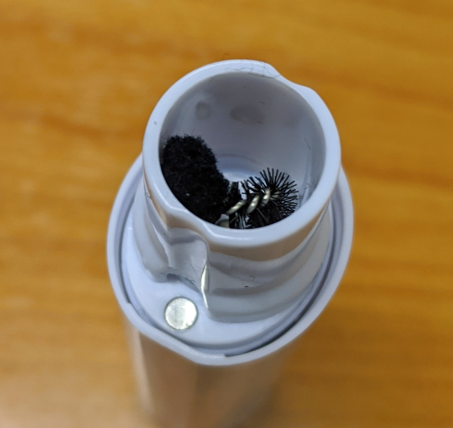 本体のキャップを取ると、筒の内部に半円状のブラシがある。これが回転することによって、アイコスのホルダーの掃除ができるようだ。
