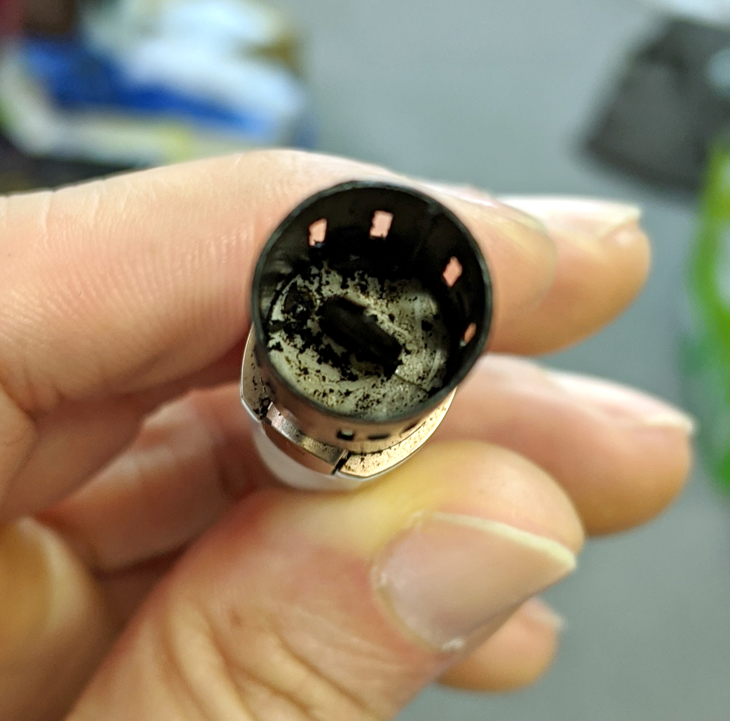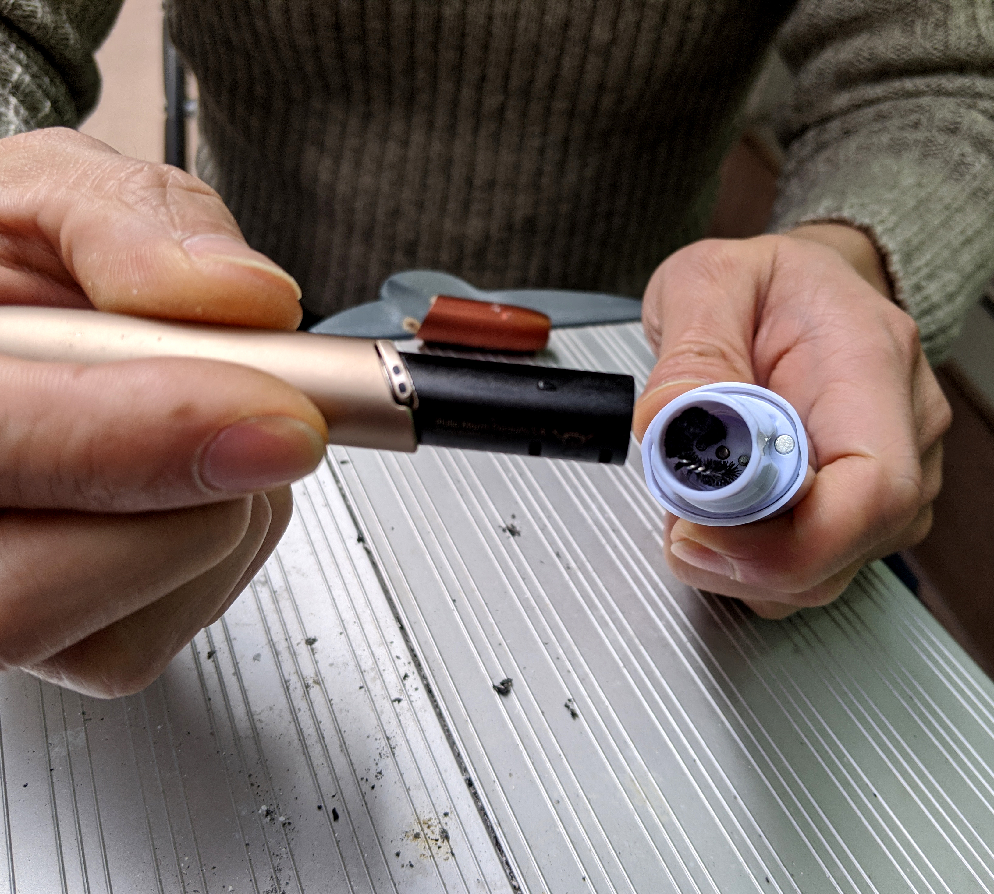 使ってみて、どれほどキレイになるものなのか? 普段から掃除を怠りがちな編集部・Yoshioのアイコスで検証してみよう。Yoshioのホルダーを借りると、「さっき掃除したからキレイだよ」という。見てみると……。