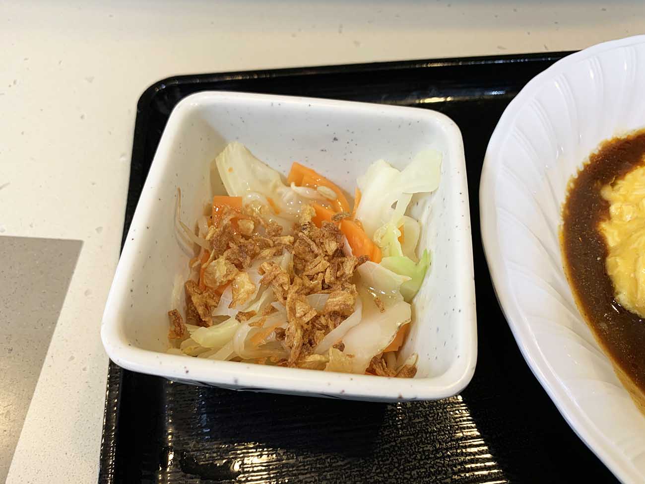 ホンゲェェェエエエ! 自ら退路を断ちおった!! 確かに券売機のボタンに「うれしいサラダ付き」って書いてたけどてっきりオマケ的なものかとばかり思っていた。まさかこれがセットの相棒だったなんて……わけがわからないよ。富士そばは一体何がやりたいんだい?