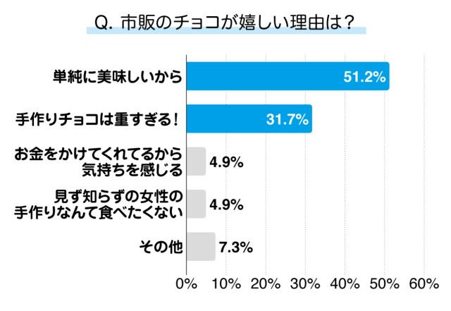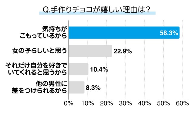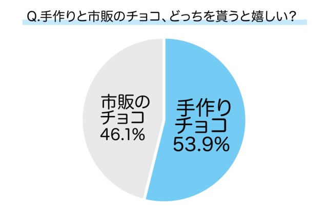 まったく参考にならなかった。ちなみに、男性に手作りチョコと市販のチョコ、どちらをもらうと嬉しいか聞いたところ、53.9%が「手作りの方が良い」と回答したらしいぞ。理由は「気持ちがこもっているから」が圧倒的だったとのこと。私も含め、男とはなんとちょろい生き物なのか。