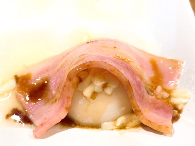 一口でいただくにはやや大きいサイズ感の温かいベーコンチーズ白玉にかぶりついてみると……もちふわだ〜! ジューシーなベーコンとチーズに、モチモチなのにふわふわな食感の白玉が妙にマッチする。