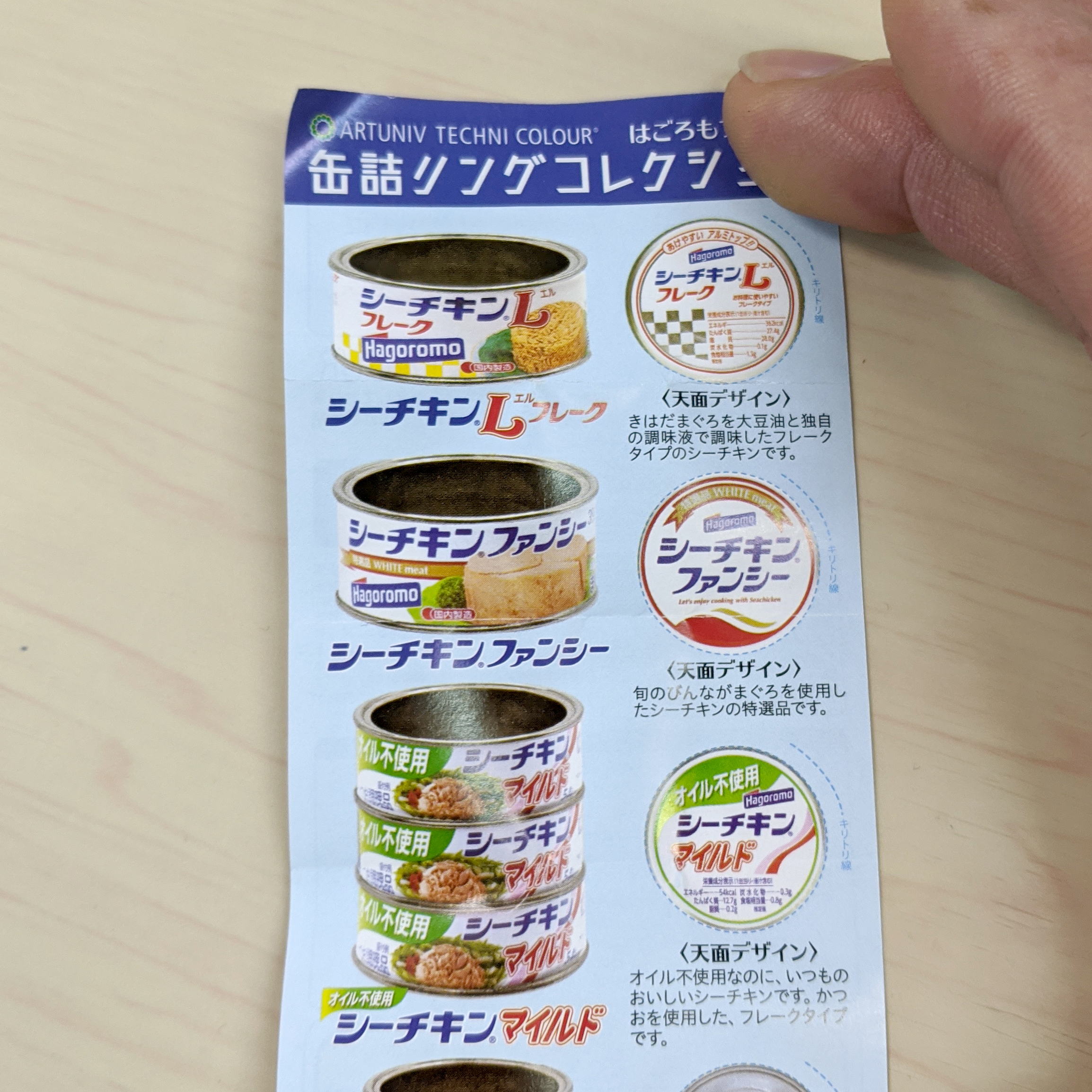 カプセルのなかに入っていたのは、「シーチキンL」と3連リングの「シーチキンマイルド」だ! ヒャッホーッ!! やったぜ、シーチキンだ!
