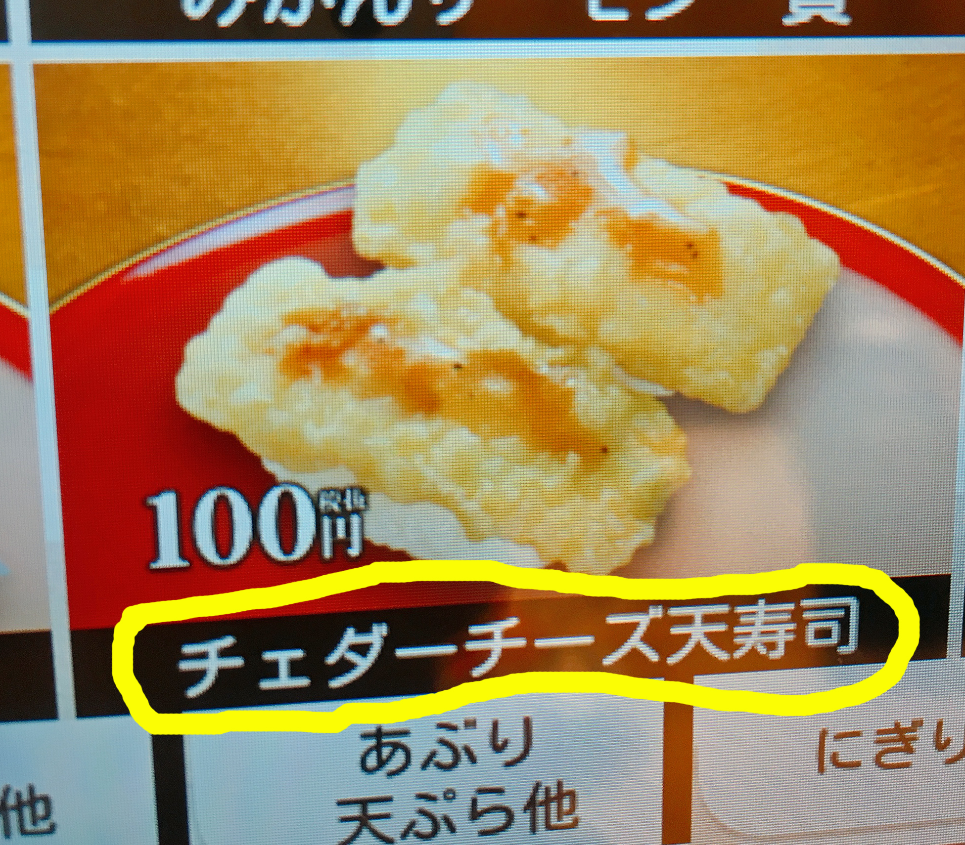 チェダーチーズ寿司でも十分なインパクトなのに、それを “天” にして寿司にするとは!? ちょっと味のイメージがつかないんだけど……。とにかく食えばわかる、ということで注文してみた。