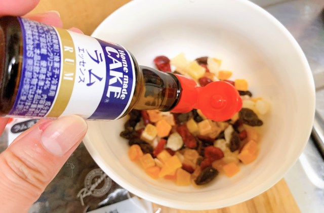 2:クランキービスケットを4等分に切って1に加え、ドライフルーツ類も加えて全体によく混ぜる。ドライフルーツはラムに付けて、レンジで十数秒温めると良い。