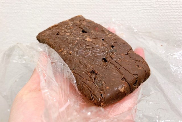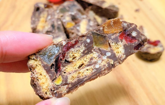 口に入れると、ドライフルーツの甘みと香りがチョコにベストマッチしている。クランキービスケットの効果か、シャリっとした歯ごたえだ。そもそも美味しいものを混ぜ合わせているのだから、美味しくないわけがないのである。