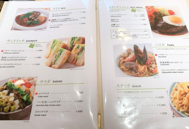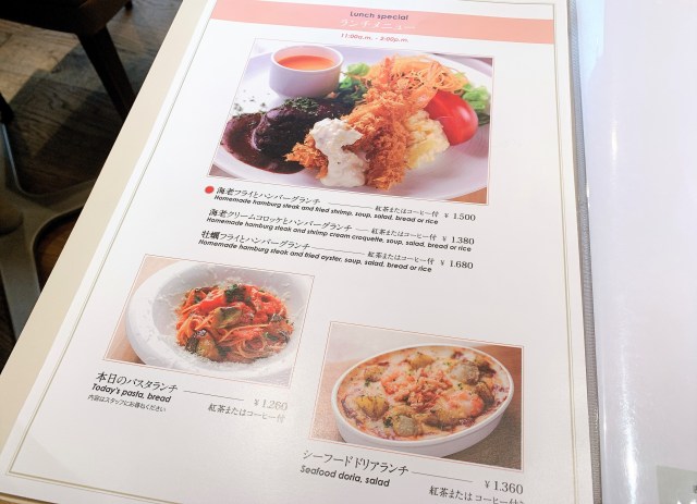 コーヒーなどのドリンクのほか、ランチメニューまであるではないか。店員さんに進められるがまま “海老フライとハンバーグランチ(税込1500円)” を注文。紅茶またはコーヒーが付くとのことなので、紅茶をセレクトだ。
