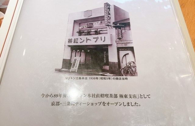 どうやらリプトンは京都とゆかりが深いらしい。リプトンの公式サイトでは、三条の “本店” 、京都駅の “ポルタ店” 、四条寺町の “ティーハウス店” と、京都市内の3店舗が紹介されている。ちなみに今から90年前の1930年、「リプトン本社直轄 喫茶部 極東支店」としてオープンしたのが京都・三条にある店舗だそうだ。