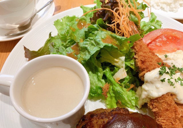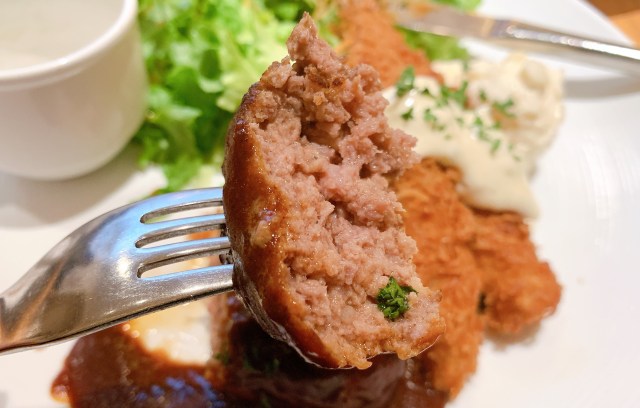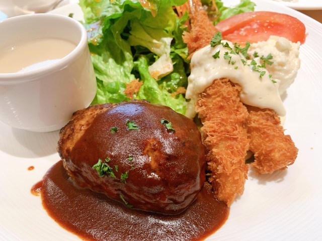 しばらくして運ばれてきたランチは、お子さまランチのようなワクワクするビジュアル。ほど良い大きさのハンバーグは肉の旨味がたっぷりだ。海老フライも、衣がパリッとしていてウマい。なにより、モリっと盛られたサラダが嬉しい。