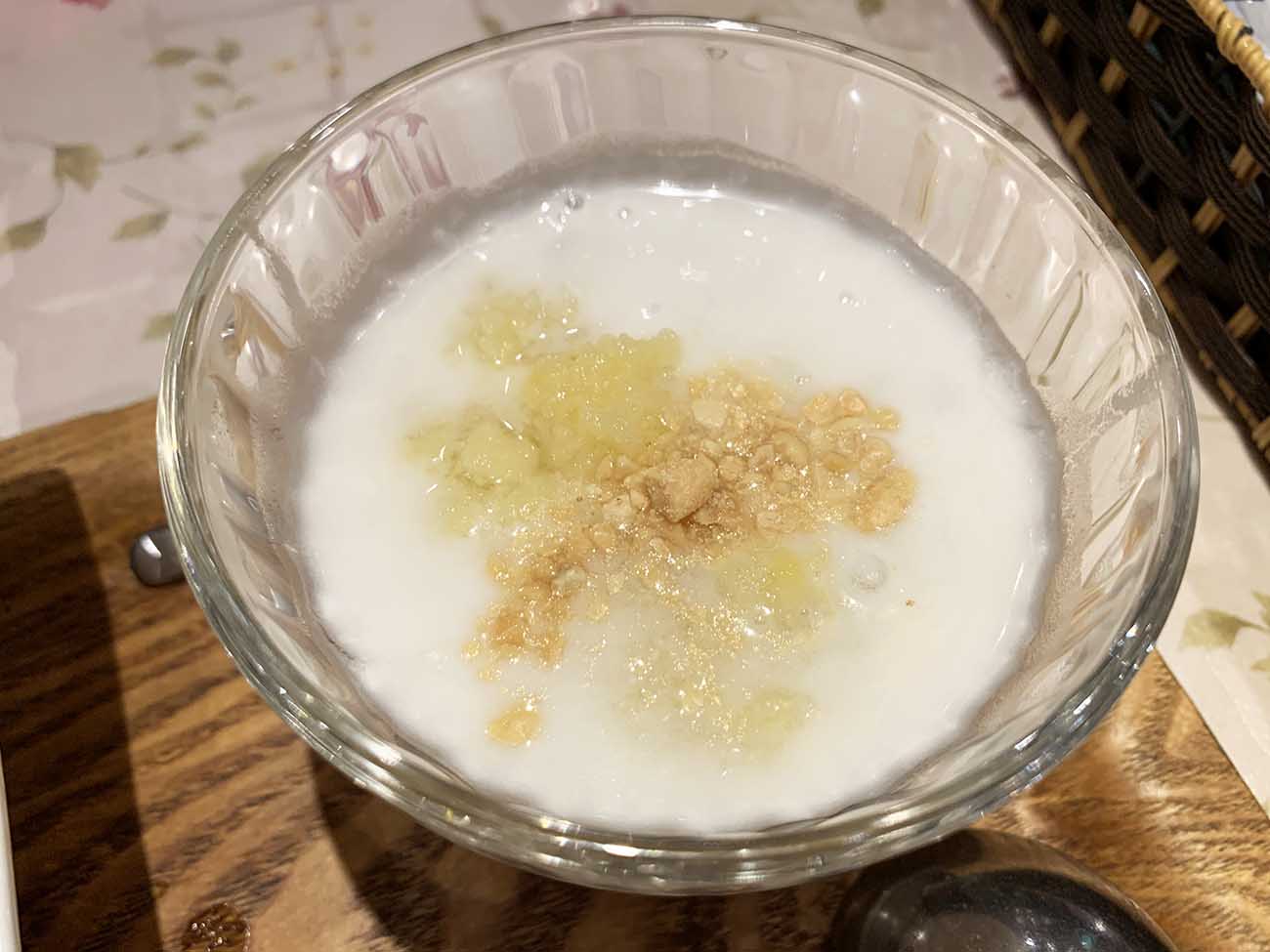 ▼デザートはココナッツと栗っぽい味がしたが、どうやら上に乗ってるのはタピオカみたいだ