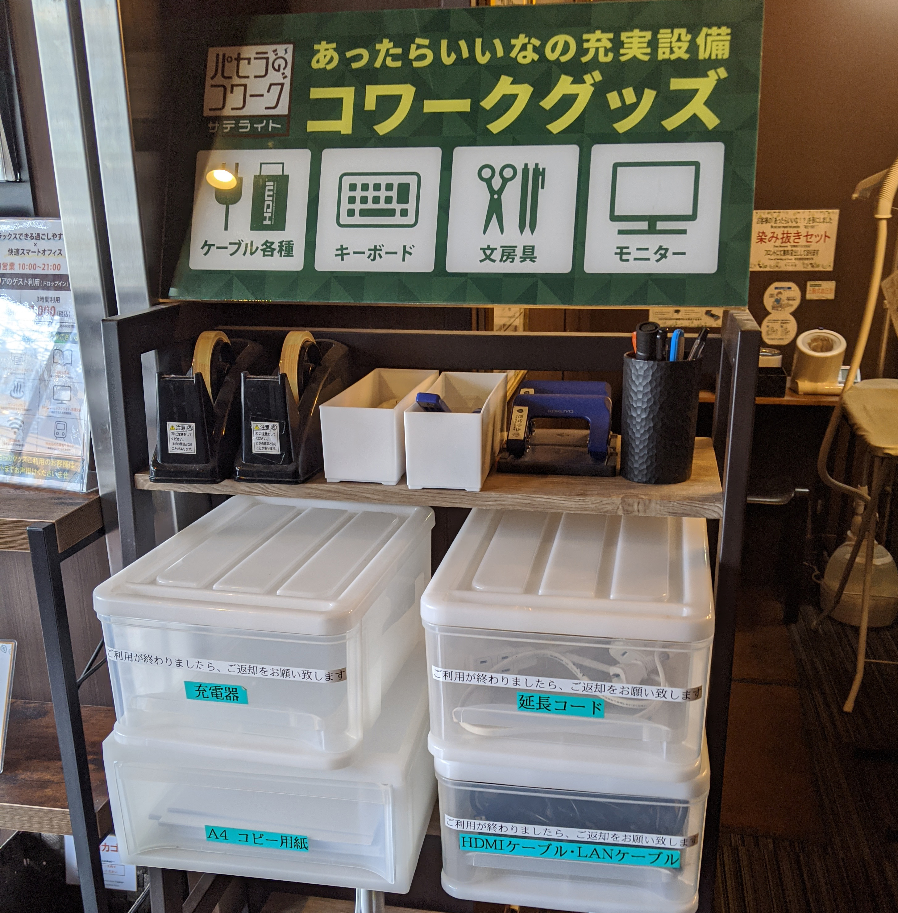 さらに、文房具やスマホ充電器、モニターまで無料貸し出している。これは有難い! さすが「パセラのコワーク(パセラが運営するコワーキングスペース)」のサテライト店として機能しているだけはある。ビジネスマンが欲しいものをよくわかってる。