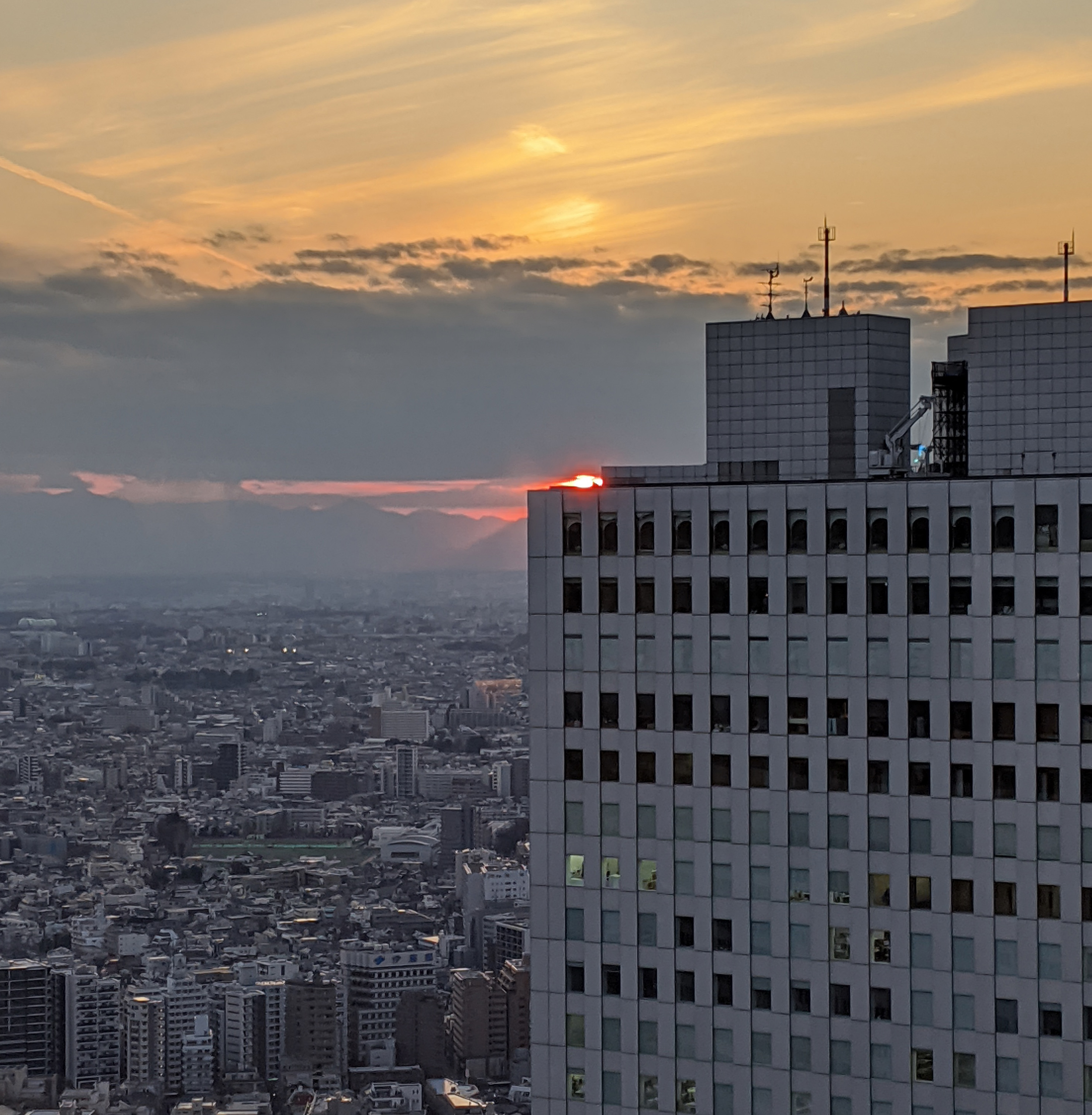夕日が拝めると思ったが、残念ながらこの日は曇りでオマケに建物の影に隠れてしまった。タイミングがよければ、真っ赤な夕日を見ながら仕事ができてしまう。とてもぜい沢な環境だ。