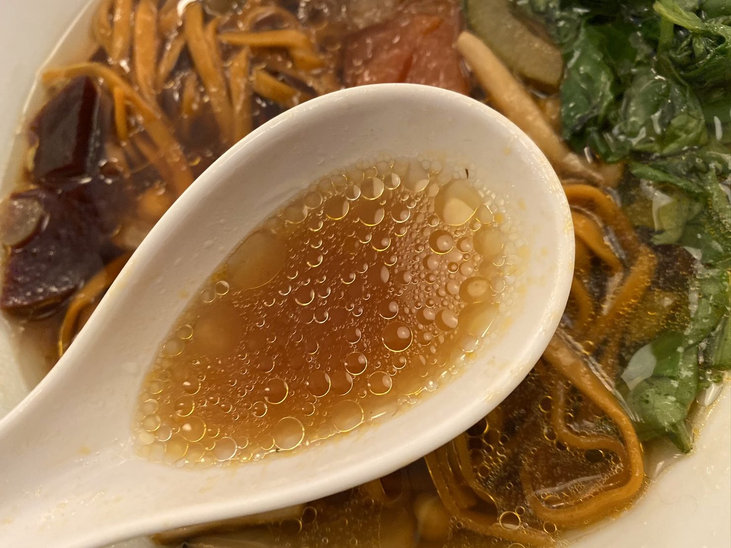 むしろ「一風堂らしくなさ」ならいくらでも挙げることができそうである。ご存知のとおり一風堂の代名詞は “とんこつスープ” 。「茸の香りとベジ」とは真逆の立ち位置といってもいい。正直言ってこれほど一風堂のイメージから遠いラーメンも他にないのではないか。