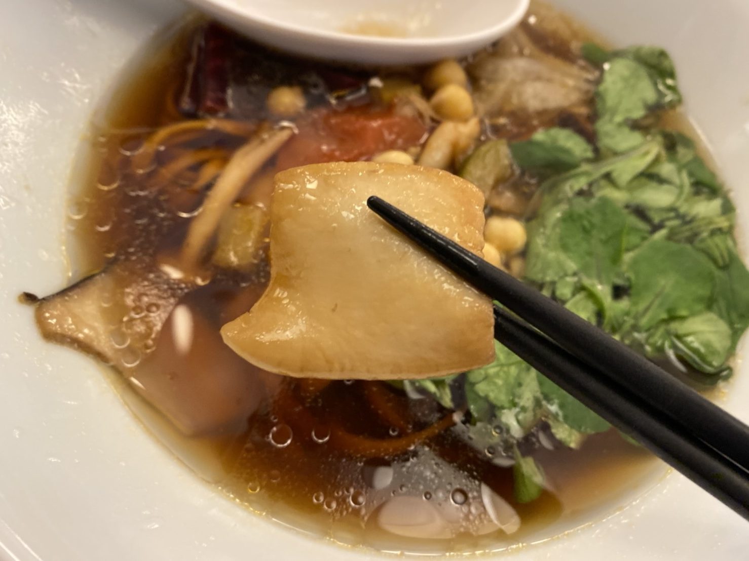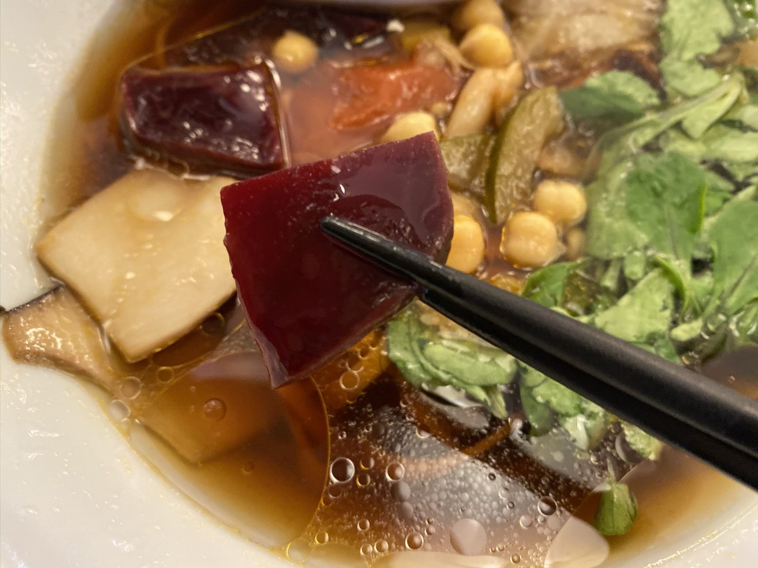 茸香るベジ麺の全貌は、その名のとおりベジタブル=野菜のみで作られたラーメン。ラーメンに欠かせないチャーシューの代わりとしてエリンギや赤カブが使用されている。
