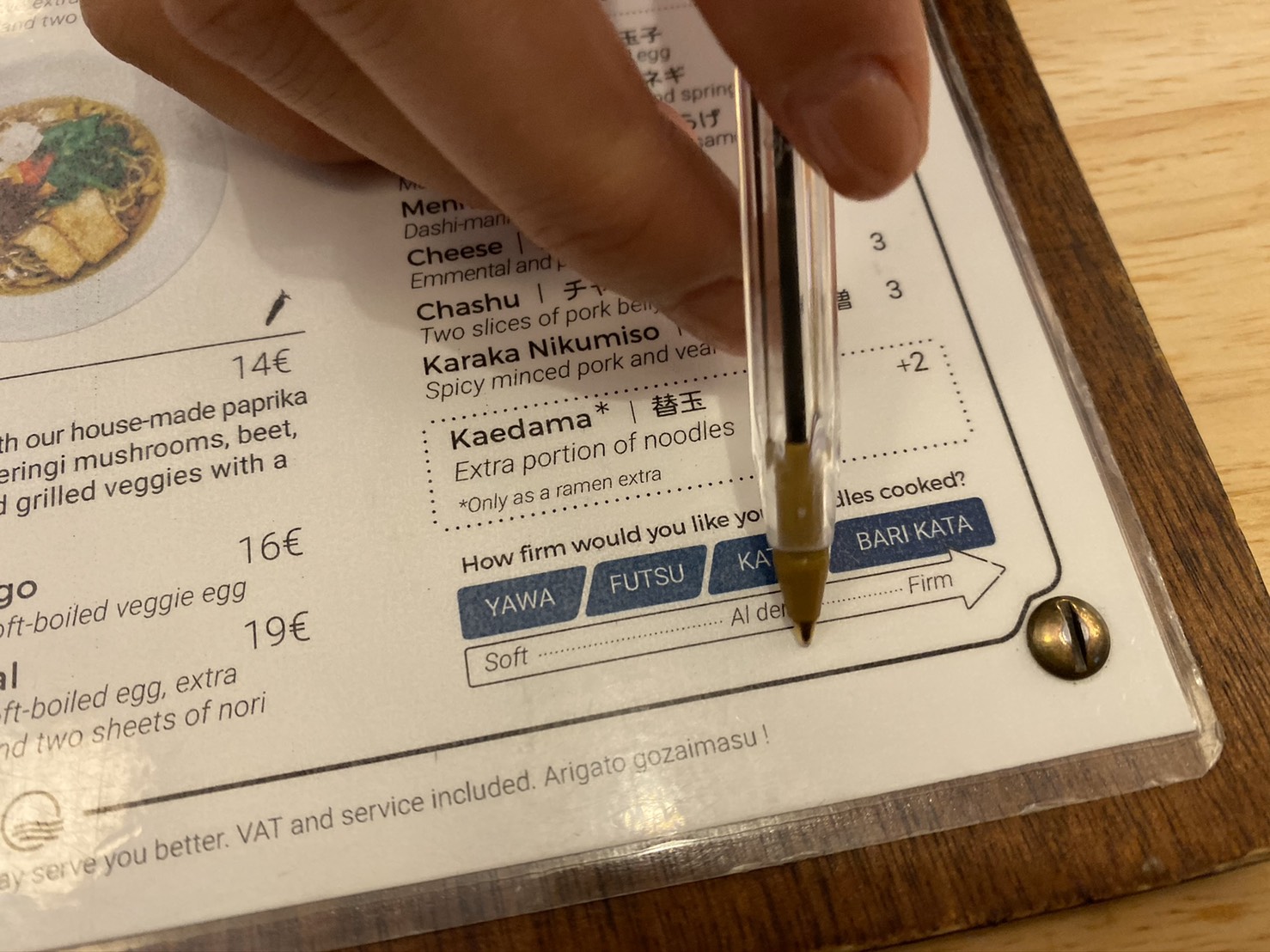 すると日本と同様「麺の硬さは」と尋ねられた。メニューには日本語で「YAWA」「FUTSU」「KATA」「BARIKATA」との表記がある。茸香るベジ麺の場合 “バリカタ” は不可らしいので ”カタ” をオーダー。