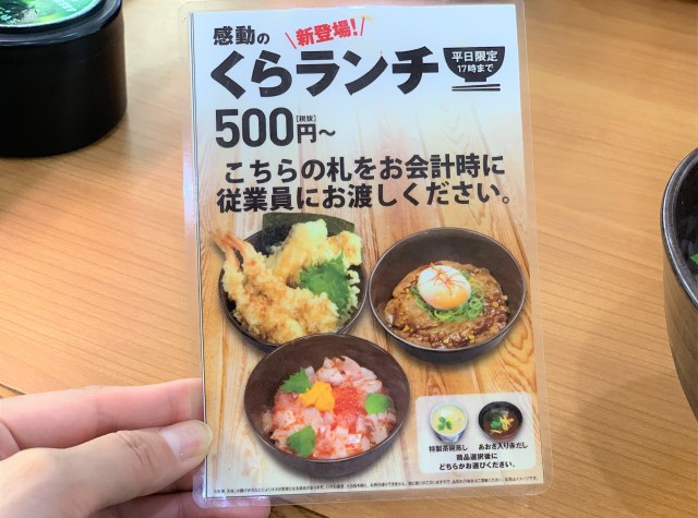 そんなこんなで、今さら驚かないだろうから、サクッとお伝えしちゃおう。くら寿司が平日限定でランチ始めたってよ。いくつか種類があり、海鮮丼や天丼のセットが550円から食べられるのだ。これがナカナカ良いのだが、アレができないのがちょっと残念だ。アレ好きなんだけどな……。