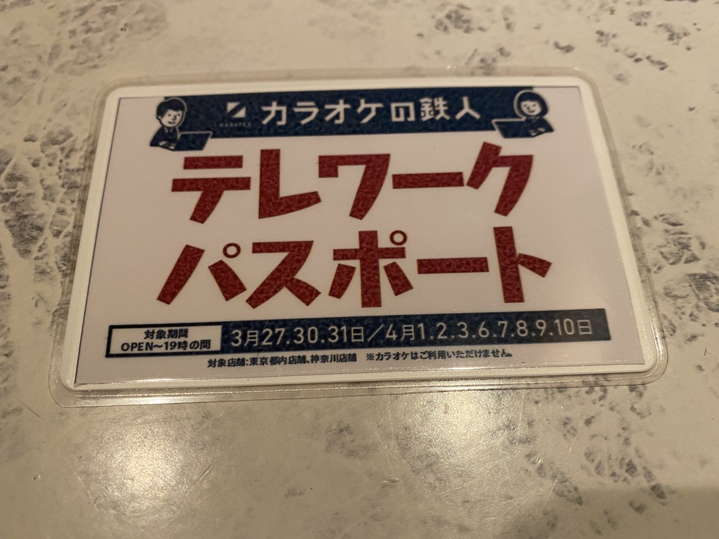 カラ鉄の『テレワークパスポート』は3月27、30、31、4月1、2、3、6、7、8、9、10日の計11日間、開店〜19時までの間で使い放題という内容だ。「4月10日までの土日を除く全平日」というふうに理解すればいいだろう。