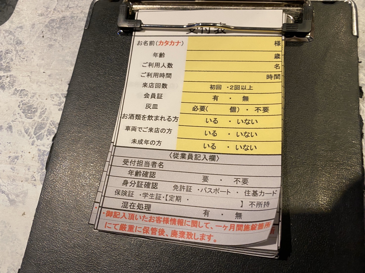 営業中だった店舗へ行き「テレワークパスを……」と告げれば即座に発行してもらえた。通常のカラオケ同様、受付表に名前等を記入するだけでOK。