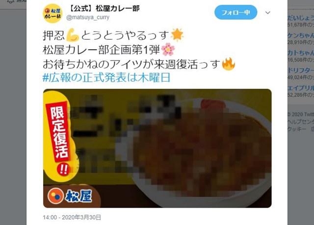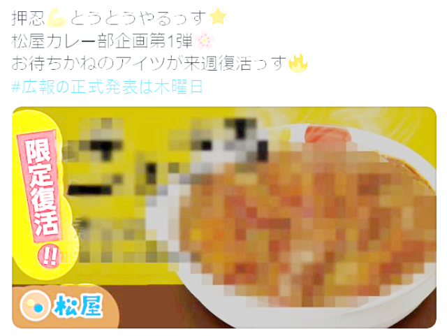 本日2020年3月30日、【公式】松屋カレー部(@matsuya_curry)という松屋のカレー専門Twitterアカウントが気になる画像を投稿したのだ。全体的にモザイクがかかってはいるものの、この色……! そしてこのシルエット……!! 間違いねぇ。絶対アイツだ! アイツが帰ってきたんだーーーーー!!!!