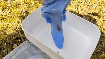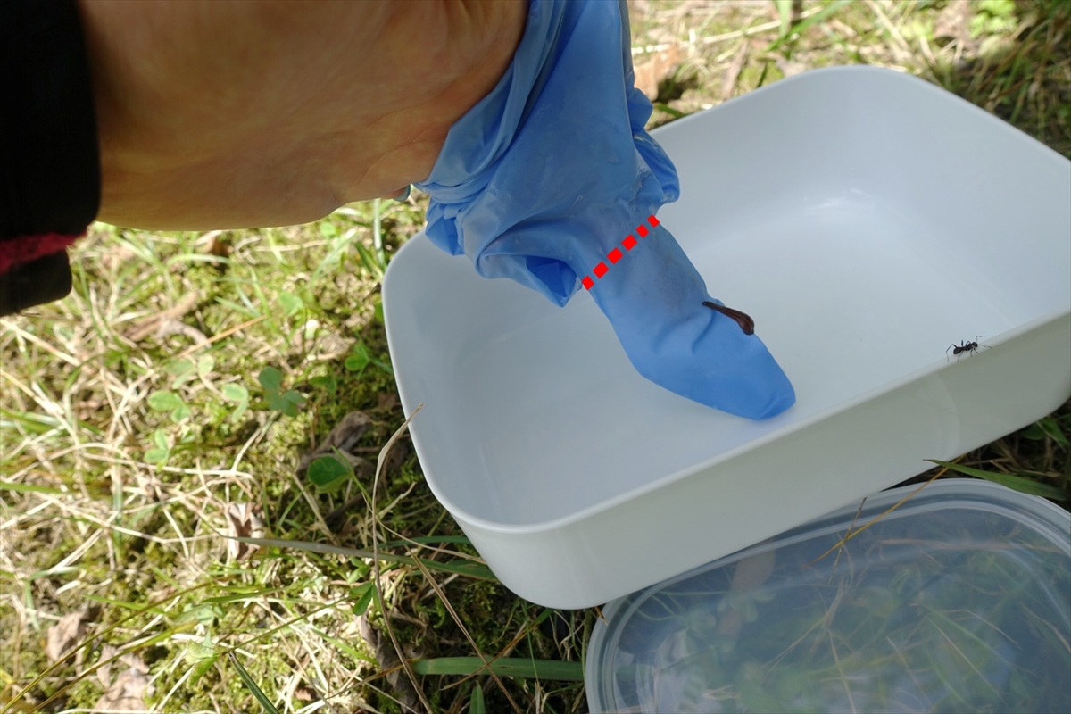 ビニール手袋ですくい上げるように捕まえ、捕獲用に持ってきたタッパーに叩き落そうとするが……落ちない。お尻側にある吸盤のようなもので貼り付いたまま、まったく手袋から離れようとしないのだ。