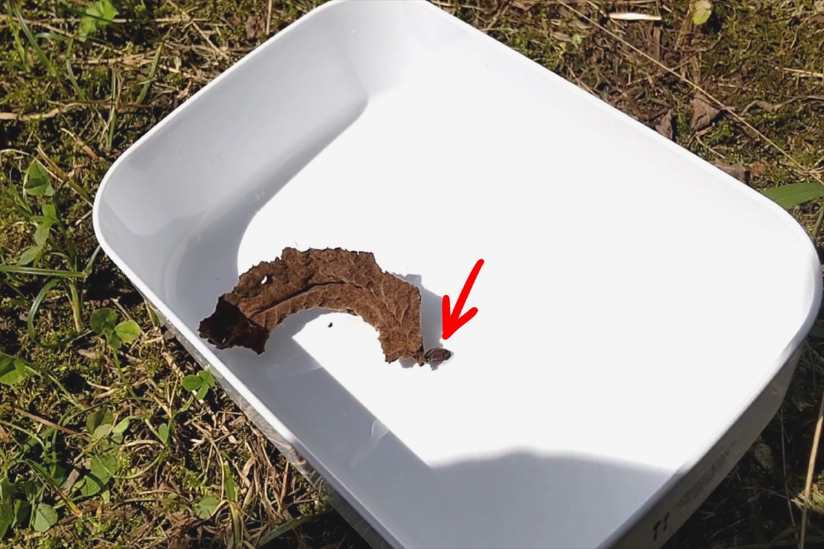ヒルが突然タッパーの底に落ちた。そればかりかキューっと縮こまって動かなくなってしまった。