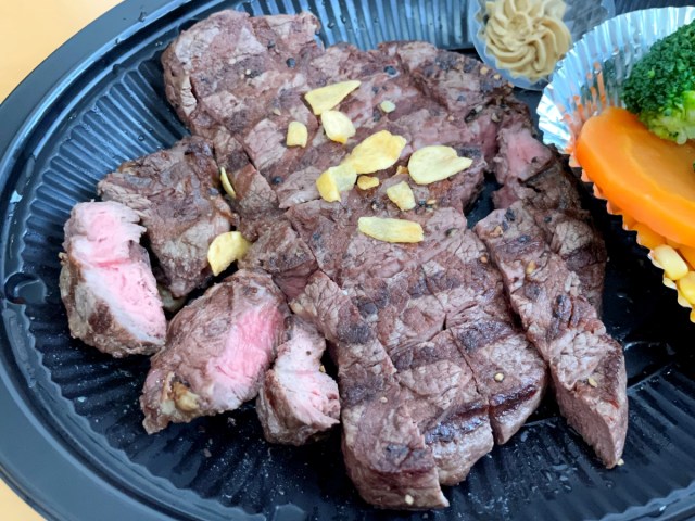 それに、冷めてもステーキ自体はめちゃくちゃウマかった。断面も美しく、とにかく肉厚で柔らか。私はけっこうな頻度で自宅でステーキを焼くのだけど、やはりプロの技は違うと言わざるを得ない。繰り返すが、これが半額ってのはマジで神である! 神である……の……だ……が……