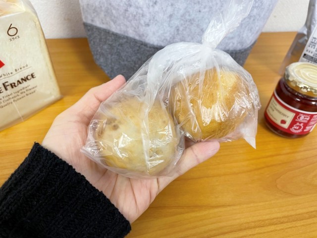 お買物券は去年と同じく500円相当が1枚(2022年2月28日まで有効)。6枚切りの食パンが入っていたのも去年と同じである。あとは菓子パンや総菜パンがいくつか入ってるんだろうな……と思いきや。