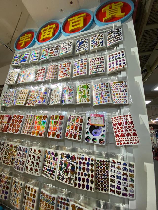 柱一面の、東南アジアから買いつけたという、個性豊かなキラキラシールは目移りするものばかり。中高生時代はよくシール買ってたなぁ。プリ帳やガラケーに貼ったりしたっけ。