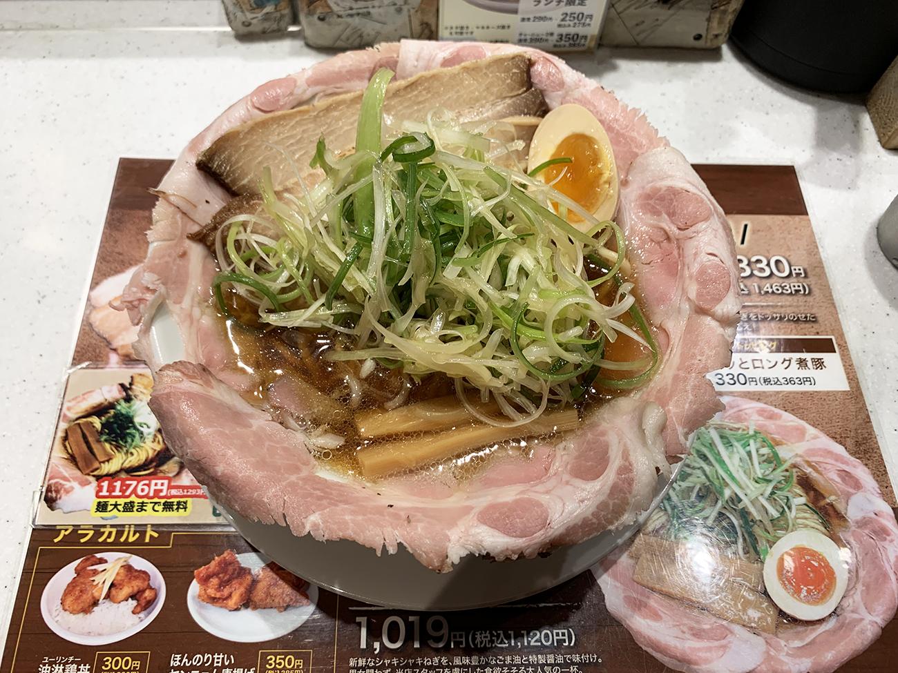 それが「絶品特製ねぎ&トロッとロング煮豚ピストル(煮卵ハーフ付き)」だ。盛り盛りなだけあり税込み1463円するが、せっかく西新宿店に来ているため、こちらを注文してみたところ……