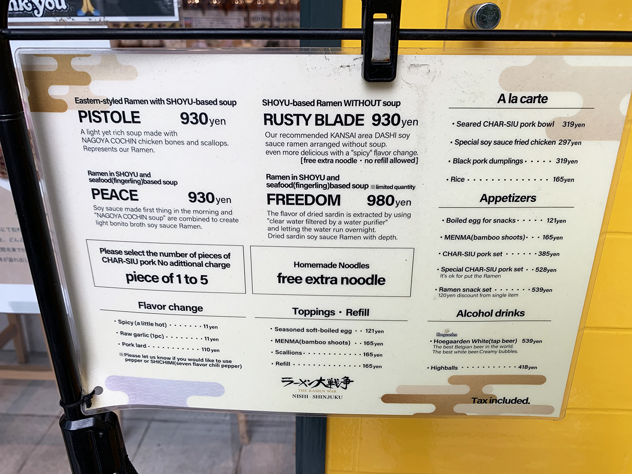 西新宿店に行ったところ、こだわりのラーメン屋にありがちな濃縮された汚さはなく、どちらかと言うと綺麗サッパリした店構え。店頭には英語でも説明が書かれており、外国人に対する気配りを感じた。