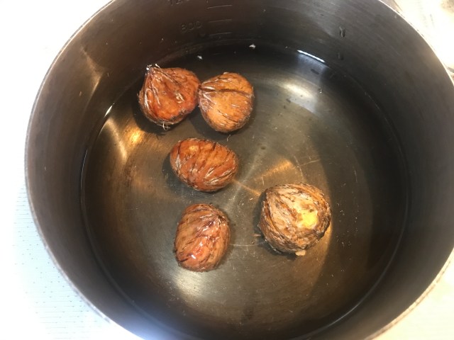 たしかに、こころなしかさっきのときよりも、鬼皮がツルッと剥ける気がする。手でポロンっと鬼皮が気持ちよく剥ける。剥きづらい底のザラザラのところもベリベリっと剥がれた。しかし、渋皮までは剥がれなかった。