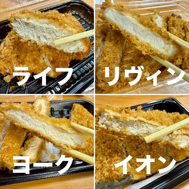 ライフは肉厚で、ヨークフーズは柔らかくジューシーな食感。イオンは衣がしんなりしていたので、時間が空いた場合はオーブン等でサクサク感を復活させた方がいいかも。