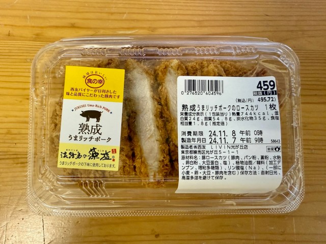 つづいては、西友が運営するスーパー・リヴィン(LIVIN)の登場だ。西友は東北から関西まで約240店舗を展開している。商品名は「熟成うまリッチポークのロースカツ」で、価格は495円。今回ご紹介する4種類の中で最も高額である。