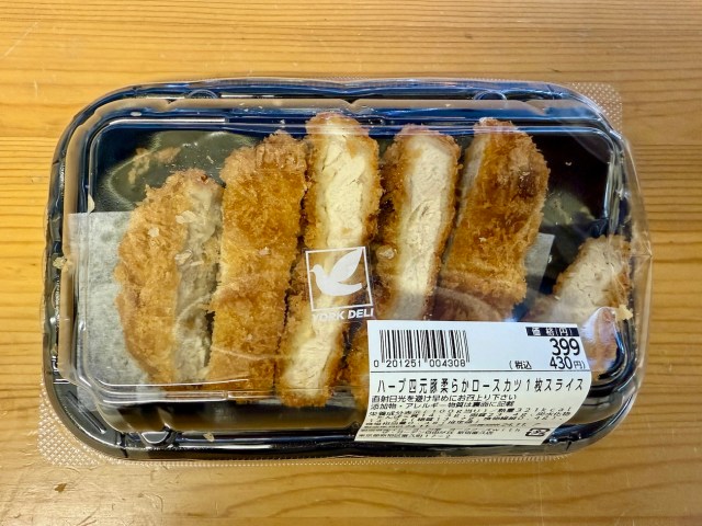 3番手はヨークフーズ。セブン傘下のイトーヨーカ堂が関東南部に展開するスーパーだ。他にヨークマート、ヨークプライス、コンフォートマーケットもある。商品名は「ハーブ四元豚柔らかロースカツ1枚スライス」で、価格は430円。ライフとほぼ同価格。
