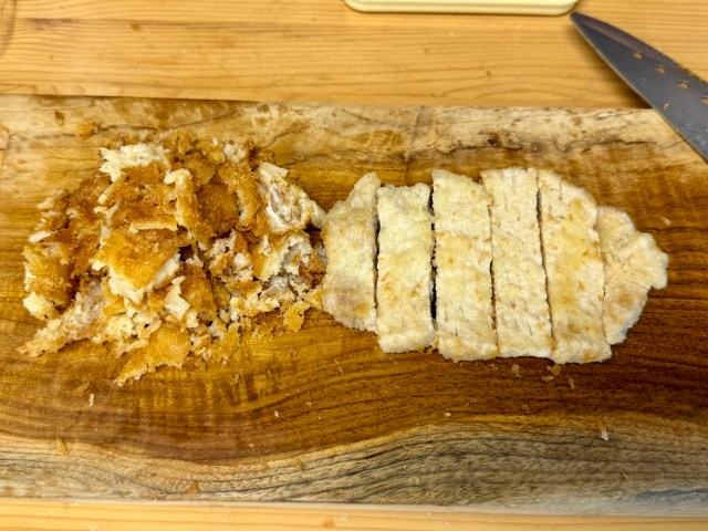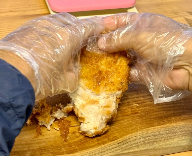 さっそく衣をはがしてみると……肉と衣の間に隙間がなく、かなりはがしにくい。つまり良いとんかつと言えるのではないだろうか。完全に豚肉と衣が一体化している。