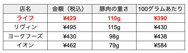 ▼肉の良し悪し関係なく100g当たりで一番安かったのは、ライフのとんかつでした!