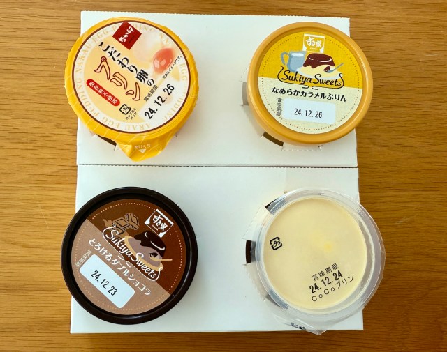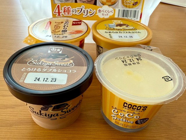 なんと……すき家(2種類)、なか卯、ココスのプリンを食べ比べできるのだ!