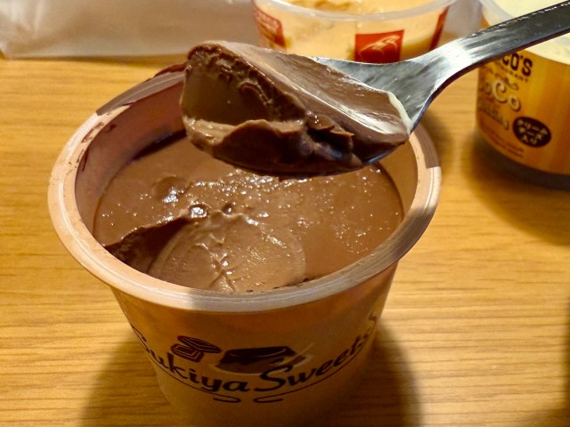 んで、「すき家のダブルショコラ」はねっとり濃厚系。とはいえ、カカオ80%のチョコレートを使用していて甘すぎないのが特徴だ。単品でもコンビニスイーツと戦えるレベルのクオリティである。
