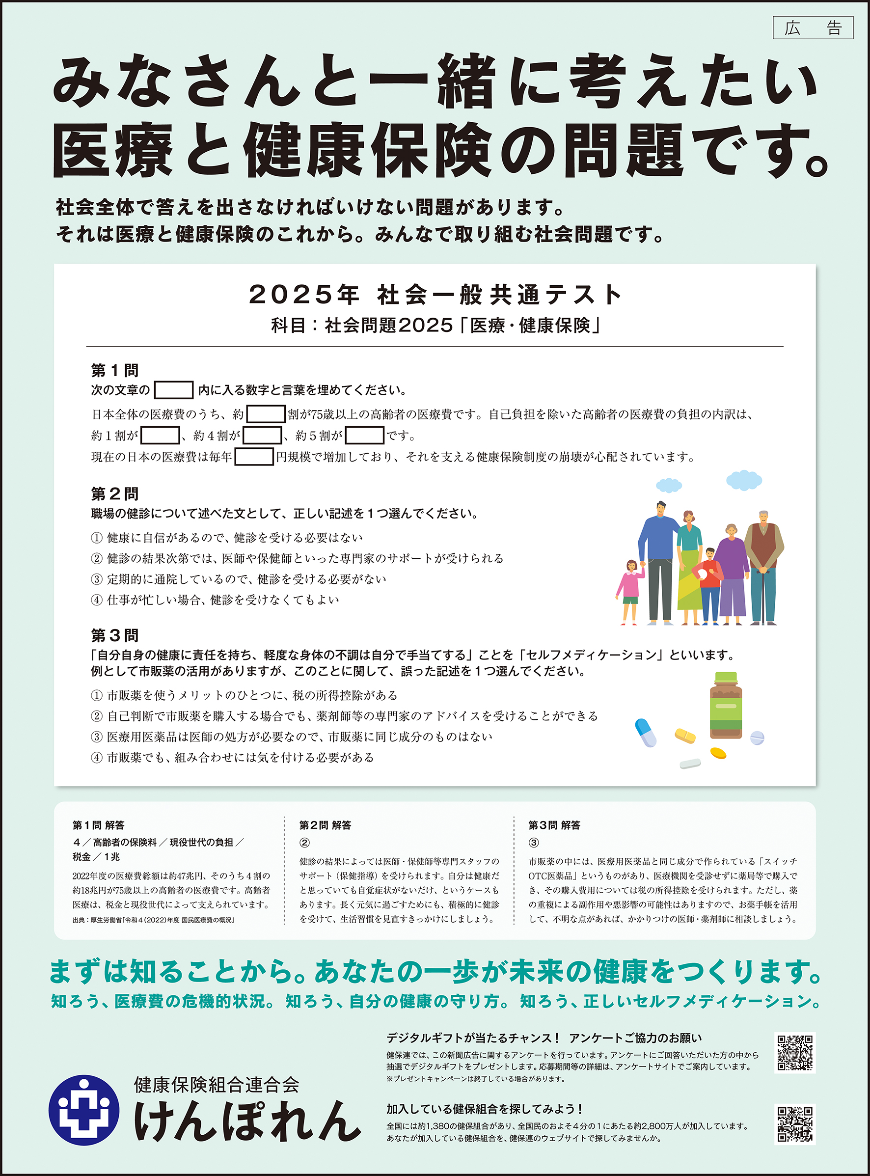 「みなさんと一緒に考えたい 医療と健康保険の問題です」と太めのフォントで書かれた試験問題風のヤツ。これは試験問題速報にタイミングをあわせた(?)『けんぽれん(健康保険組合連合会)』の広告らしい。