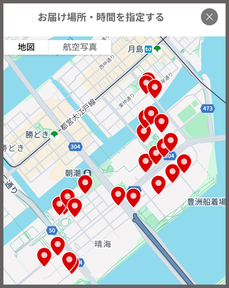 「ベイシティ晴海スカイリンクタワー」が受け取りにちょうど良さそうだ。ここにしよう。場所を選択すると、受け取り時間が表示されるので、そのなかから都合の良い時間帯を選ぶ。