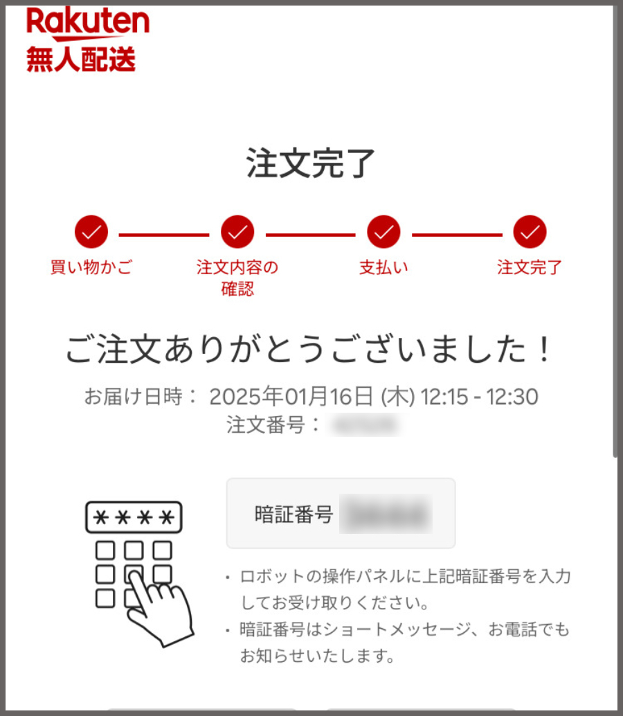 とにかく注文完了。画面下の「暗唱番号」はボックス型ロボットのフタをあけるのに必要になる。