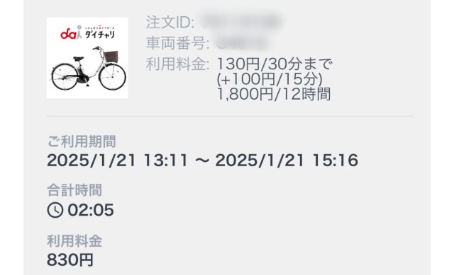 浜松町でレンタルしたのが午後1時11分、勝どきで返却したのが午後3時16分。よってトータルの利用時間は2時間5分、料金は税込830円である!
