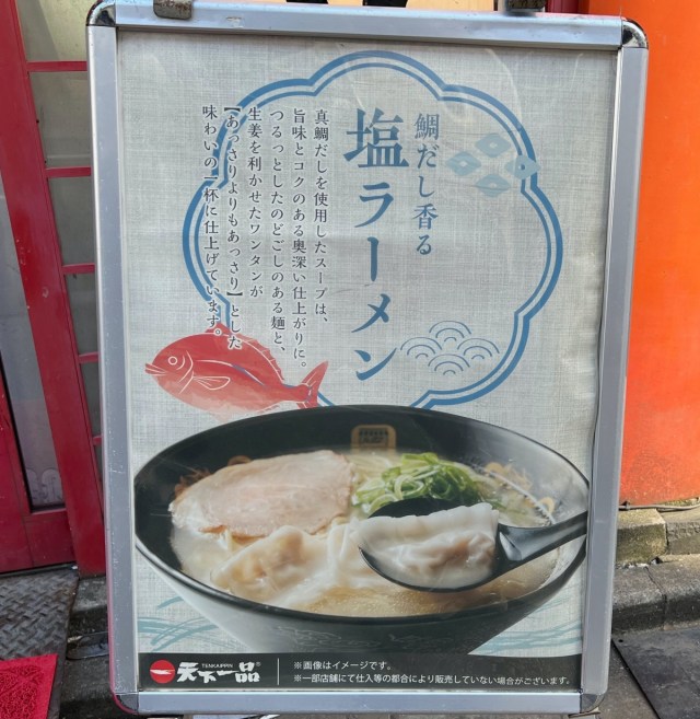 表には「塩ラーメン」の看板が出ており、絶賛売り出し中っぽい。なんでも、鯛だしを使用したスープなのだとか。でも値段が書かれていない。一体いくらなんだろう? と思いながら入店。