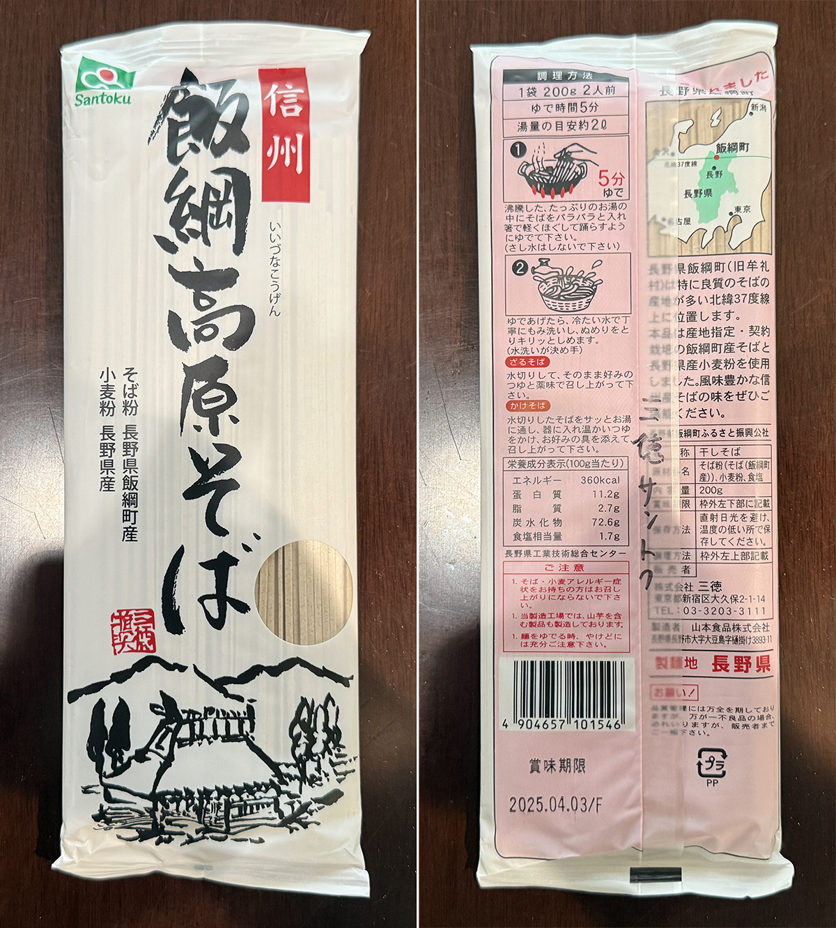 食品スーパーマーケット三徳(Santoku)のPB蕎麦『信州 飯綱高原そば』の製造者は、皆さんお馴染みの山本食品。山本の十八番である「十割」ではないが、そば粉先行の蕎麦である。