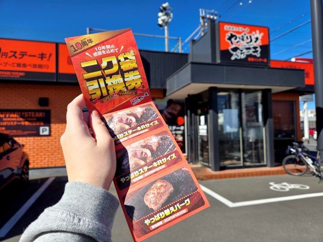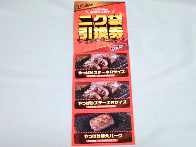 「10周年記念ニク袋」の目玉は、ステーキやハンバーグを食べることができる「引換券」。