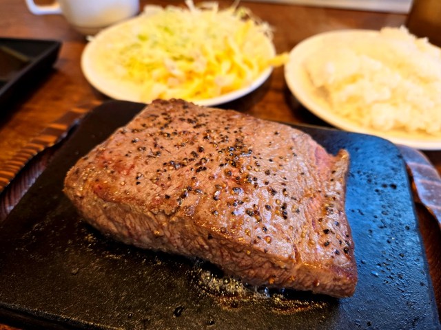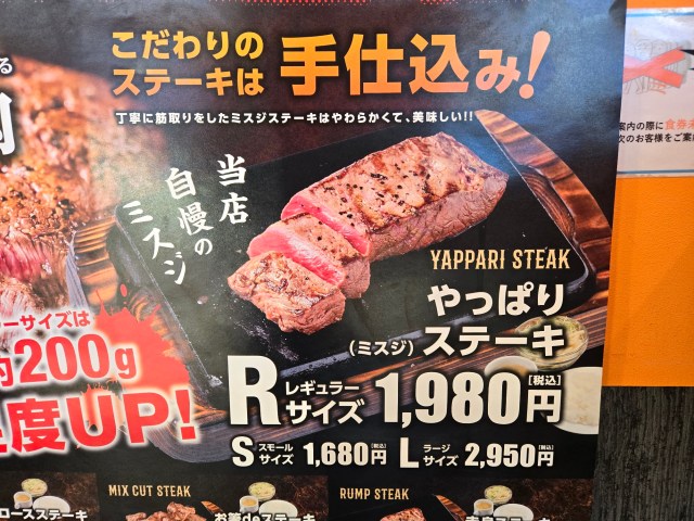 店内に貼ってあったメニューを見てみたところ、今食べているRサイズの「やっぱりステーキ」は1980円もするらしい。そして、数年前に1000円で楽しんでいたものと同じ現行の150gセットは1680円へと値上がりしていた。マジかよ……。