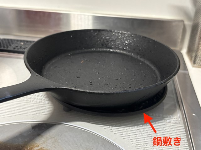 ちなみに、鉄の鍋敷きに置いておくと風通しがよく、使い終わったあとにフライパンを冷ます時間も短縮にもなる。